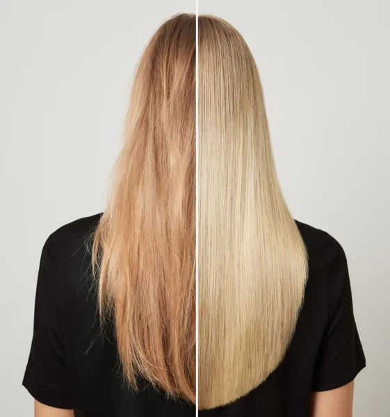 Stav vlasů před odbarvováním (a před aplikací přípravků A\CPLEX) a po odbarvování s použitím přípravků A\CPLEX.